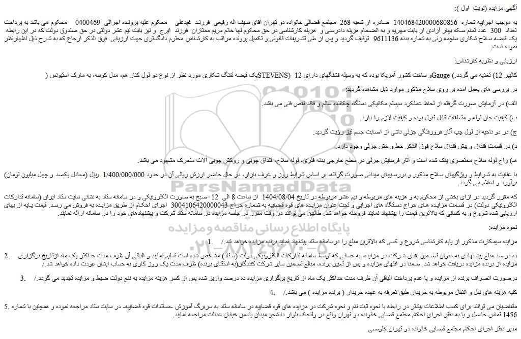به موجب اجراییه شماره 140468420000680856 صادره از شعبه 268 مجتمع قضائی خانواده دو تهران آقای سیف اله رفیعی فرزند محمدعلی محکوم علیه پرونده اجرائی 0400469 محکوم می باشد به پرداخت تعداد 300 عدد تمام سکه بهار آزادی از بابت مهریه و به انضمام هزینه دادرسی و هزینه کارشناسی در حق محکوم لها خانم مریم ممتازان فرزند ایرج و نیز بابت نیم عشر دولتی در حق صندوق دولت که در این رابطه یک قبضه سلاح شکاری ساچمه زنی به شماره بدنه 9611136 توقیف گردید و پس از طی تشریفات قانونی و تکمیل پرونده مراتب به کارشناس محترم دادگستری جهت ارزیابی فوق الذکر ارجاع که به شرح ذیل اظهارنظر نموده است: