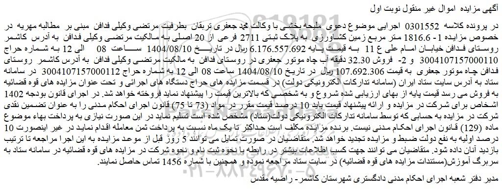 در پرونده کلاسه 0301552 اجرایی موضوع دعوی ملیحه بخشی با وکالت محمد جعفری تربقان بطرفیت مرتضی وکیلی فدافن مبنی بر مطالبه مهریه در خصوص مزایده 1- 1816.6 متر مربع زمین کشاورزی به پلاک ثبتی 2711 فرعی از 20 اصلی به مالکیت مرتضی وکیلی فدافن به آدرس کاشمر روستای فدافن خیابان امام علی ع 11 به قیمت پایه 6.176.557.692 ریال در تاریخ 1404/08/10 ساعت 08 الی 12 به شماره حراج 3004107157000110 و 2- فروش 32.30 دقیقه آب چاه موتور جعفری در روستای فدافن به مالکیت مرتضی وکیلی فدافن به آدرس کاشمر روستای فدافن چاه موتور جعفری به قیمت 107.692.306 ریال در تاریخ 1404/08/10 ساعت 08 الی 12 به شماره حراج 3004107157000112 در سامانه ستاد به آدرس سایت ستاد ایران (سامانه تدارکات الکترونیکی دولت) در قسمت مزایده های حراج دستگاه های اجرائی و تحت عنوان مزایده های قوه قضائیه به فروش می رسد قیمت پایه از بهای ارزیابی شده شروع و به شخصی که بالاترین قیمت را پیشنهاد نماید فروخته خواهد شد. در اجرای قانون بودجه 1402 اشخاص برای شرکت در مزایده و ارائه پیشنهاد قیمت باید 10 درصد قیمت مقرر در مواد (73 تا 75) قانون اجرای احکام مدنی را به عنوان تضمین نقدی شرکت در مزایده به حسابی که توسط سامانه تدارکات الکترونیکی دولت(ستاد) مشخص شده است تسلیم نماید در این صورت نیازی به پرداخت بهاء موضوع ماده (129) قانون اجرای احکام مدنی نیست. برنده مزایده مکلف است حداکثر تا یک ماه نسبت به پرداخت ثمن معامله اقدام نماید در غیر اینصورت 10 درصد اولیه به نفع دولت ضبط و مزایده تجدید خواهد شد. متقاضیان در صورت تمایل می توانند 5 روز قبل از موعد مزایده به این اجرا مراجعه تا ترتیب بازدید آنان داده شود. متقاضیان می توانند جهت کسب اطلاعات بیشتر در رابطه با نحوه ثبت نام و نحوه شرکت در مزایده های قوه قضائیه در سامانه ستاد به سربرگ آموزش(مستندات مزایده های قوه قضائیه) در سایت ستاد مراجعه نموده و همچنین با شماره 1456 تماس حاصل نمایند.