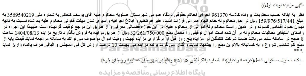 نظر به اینکه حسب محتویات پرونده کلاسه 961370 اجرای احکام حقوقی دادگاه عمومی شهرستان عسلویه محکوم علیه اقای یوسف کنعانی به شماره ملی 3569540219 به مبلغ 159/976/517/441 ریال در حق محکوم له خانم الهام عمرانی فرزند اسد، علیرغم تنظیم و ابلاغ اجرائیه و سپری شدن مهلت قانونی محکوم علیه یاد شده نسبت به تادیه دیون خود اقدامی ننموده و در همین راستا محکوم له اموالی از محکوم علیه  در این حوزه قضائی معرفی و از طریق این مرجع توقیف گردیده است علیهذا این اجراء در راستای استیفای مطالبات محکوم له بر آن شده است اموال توقیفی را معادل مبلغ 32/261/750/000 ریال از طریق مزایده به فروش بگذارد تاریخ مزایده 1404/08/13 ساعت 8 صبح در سامانه ستاد می باشد ضمنا شرکت کنندگان در مزایده پنج روز قبل از برگزاری مزایده جهت روئیت اموال موصوف می توانند به سامانه مراجعه نمایند قیمت پایه از مبلغ کارشناسی شروع و به کسانیکه بالاترین مبلغ را پیشنهاد نمایند واگذار می گردد برنده مزایده می بایست 10 درصد ارزش کل فی المجلس و الباقی ظرف یکماه واریز نماید .**