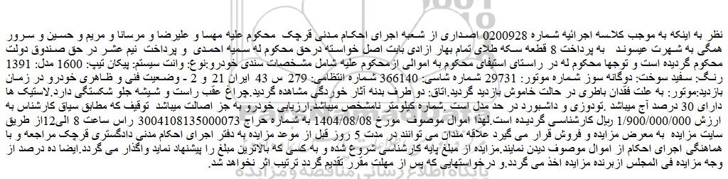 نظر به اینکه به موجب کلاسه اجرائیه شماره 0200928 اصداری از شعبه اجرای احکام مدنی قرچک محکوم علیه مهسا و علیرضا و مرسانا و مریم و حسین و سرور همگی به شهرت عیسوند به پرداخت 8 قطعه سکه طلای تمام بهار ازادی بابت اصل خواسته درحق محکوم له سمیه احمدی و پرداخت نیم عشر در حق صندوق دولت محکوم گردیده است و توجها محکوم له در راستای استیفای محکوم به اموالی ازمحکوم علیه شامل مشخصات سندی خودرو:نوع: وانت سیستم: پیکان تیپ: 1600 مدل: 1391 رنگ: سفید سوخت: دوگانه سوز شماره موتور: 29731 شماره شاسی: 366140 شماره انتظامی: 279 س 43 ایران 21 و 2 - وضعیت فنی و ظاهری خودرو در زمان بازدید:موتور: به علت فقدان باطری در حالت خاموش بازدید گردید.اتاق: دو طرف بدنه آثار خوردگی مشاهده گردید.چراغ عقب راست و شیشه جلو شکستگی دارد.لاستیک ها دارای 30 درصد آج میباشد .تودوزی و داشبورد در حد مدل است .شماره کیلومتر نامشخص میباشد.ارزیابی خودرو به جز اصالت میباشد توقیف که مطابق سیاق کارشناس به ارزش 1/900/000/000 ریال کارشناسی گردیده است.لهذا اموال موصوف مورخ 1404/08/08 به شماره حراج 3004108135000073 راس ساعت 8 الی12از طریق سایت مزایده به معرض مزایده و فروش قرار می گیرد علاقه مندان می توانند در مدت 5 روز قبل از موعد مزایده به دفتر اجرای احکام مدنی دادگستری قرچک مراجعه و با هماهنگی اجرای احکام از اموال موصوف دیدن نمایند.مزایده از مبلغ پایه کارشناسی شروع شده و به کسی که بالاترین مبلغ را پیشنهاد نماید واگذار می گردد.ایضا ده درصد از وجه مزایده فی المجلس ازبرنده مزایده اخذ می گردد.و درخواستهایی که پس از مهلت مقرر تقدیم گردد ترتیب اثر نخواهد شد.