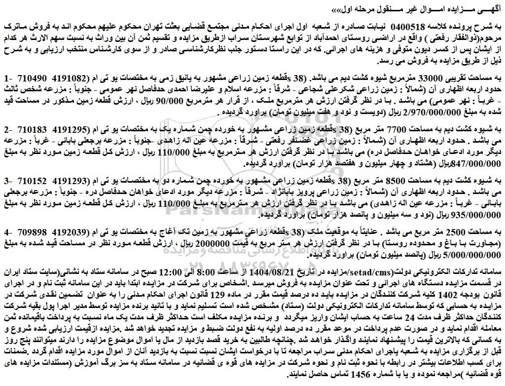 به شرح پرونده کلاسه 0400518 نیابت صادره از شعبه اول اجرای احکام مدنی مجتمع قضایی بعثت تهران محکوم علیهم محکوم اند به فروش ماترک مرحوم(ذوالفقار رفعتی ) واقع در اراضی روستای احمدآباد از توابع شهرستان سراب ازطریق مزایده و تقسیم ثمن آن بین وراث به نسبت سهم الارث هر کدام از ایشان پس از کسر دیون متوفی و هزینه های اجرائی. که در این راستا دستور جلب نظرکارشناسی صادر و از سوی کارشناس منتخب ارزیابی و به شرح ذیل از طریق مزایده به فروش می رسد.