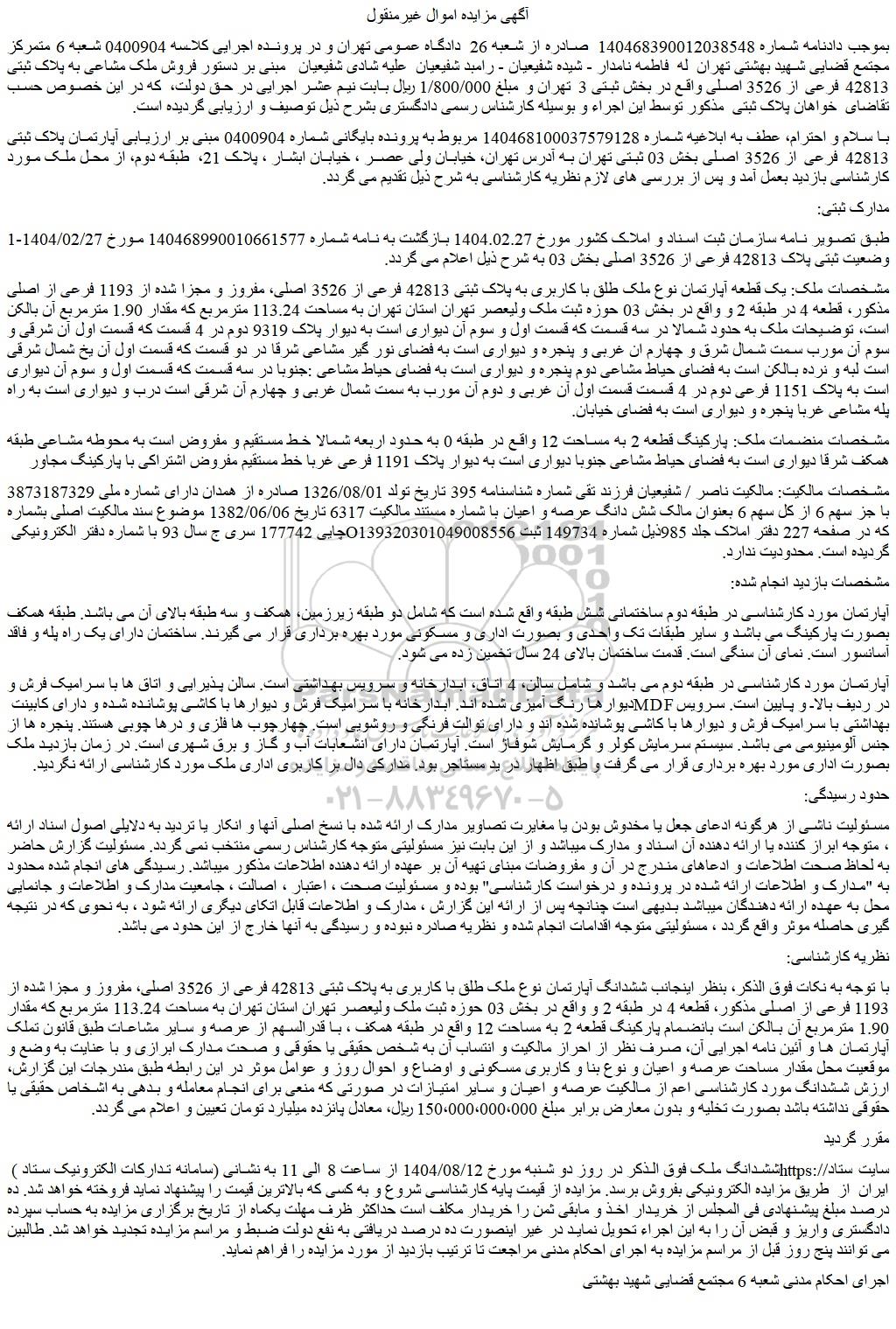 بموجب دادنامه شماره 140468390012038548 صادره از شعبه 26 دادگاه عمومی تهران و در پرونده اجرایی کلاسه 0400904 شعبه 6 متمرکز مجتمع قضایی شهید بهشتی تهران له فاطمه نامدار - شیده شفیعیان - رامبد شفیعیان علیه شادی شفیعیان مبنی بر دستور فروش ملک مشاعی به پلاک ثبتی 42813 فرعی از 3526 اصلی واقع در بخش ثبتی 3 تهران و مبلغ 1/800/000 ریال بابت نیم عشر اجرایی در حق دولت، که در این خصوص حسب تقاضای خواهان پلاک ثبتی مذکور توسط این اجراء و بوسیله کارشناس رسمی دادگستری بشرح ذیل توصیف و ارزیابی گردیده است.