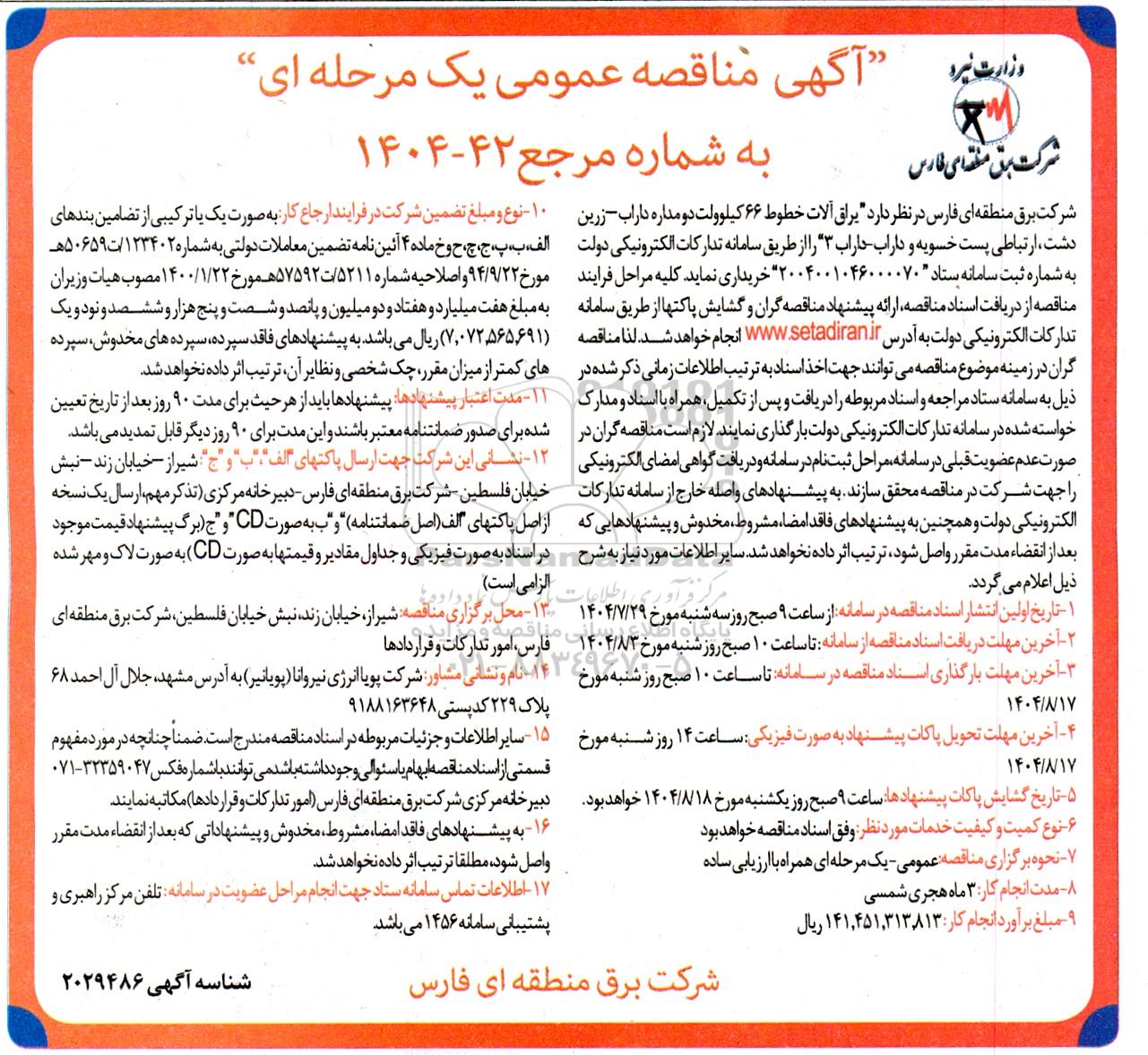 آگهی مناقصه عمومی یراق آلات خطوط 66 کیلوولت دو مداره داراب از کلیه افراد متخصص و شرکتها واجد شرایط دعوت به عمل میآید در مناقصه با کد خبرگزاری پارس نماد: 9729917 شرکت نمایند.