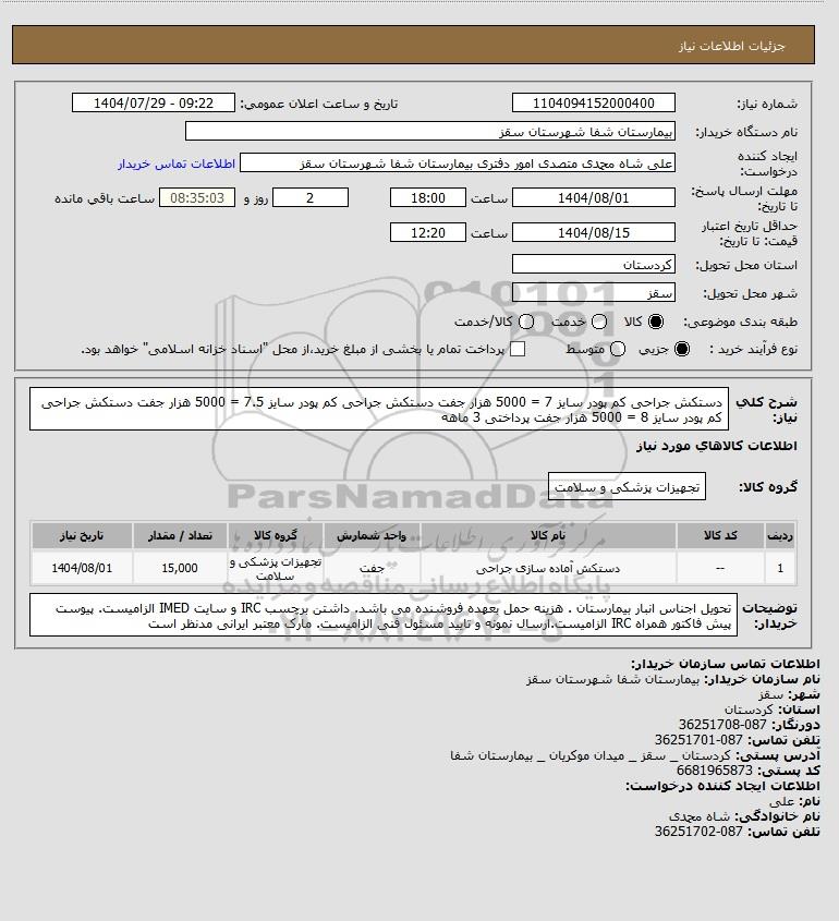 | 1 | -- | دستکش آماده سازی جراحی | جفت | تجهیزات پزشکی و سلامت | 15,000 | 1404/08/01 |