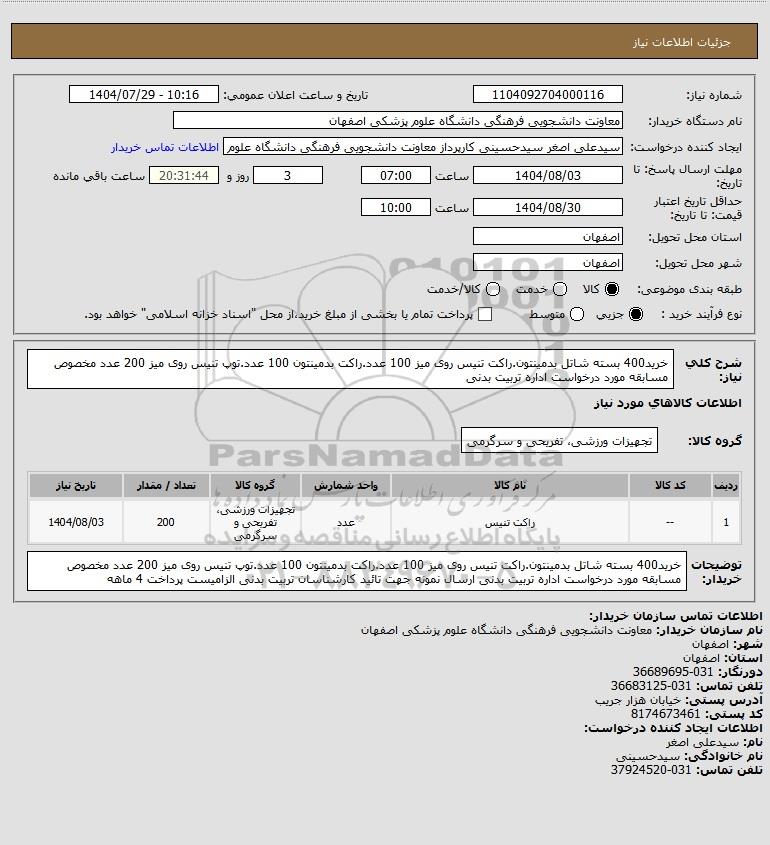 توضیحات خریدار:خرید400 بسته شاتل بدمینتون.راکت تنیس روی میز 100 عدد.راکت بدمینتون 100 عدد.توپ تنیس روی میز 200 عدد مخصوص مسابقه مورد درخواست اداره تربیت بدنی ارسال نمونه جهت تائید کارشناسان تربیت بدنی الزامیست پرداخت 4 ماهه