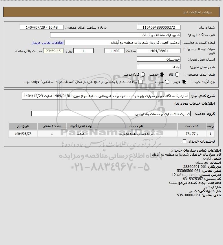 شرح کلی نیاز: اجاره یکدستگاه خودرو سواری پژو جهت مسئول واحد امورمالی منطقه دو از مورخ 1404/04/01 لغایت 1404/12/29