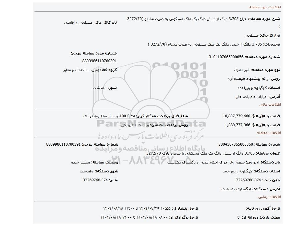 شرح مورد معامله: حراج 3.705 دانگ از شش دانگ یک ملک مسکونی به صورت مشاع (3272/70 )نام کالا: اماکن مسکونی و اقامتی