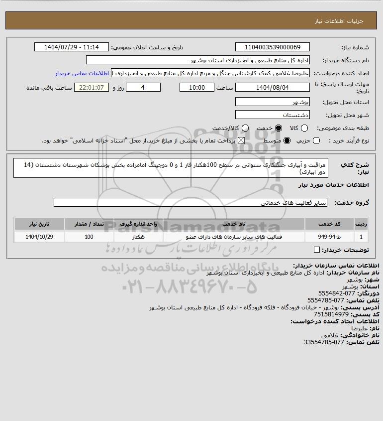 شرح کلی نیاز: مراقبت و آبیاری جنگلکاری سنواتی در سطح 100هکتار فاز 1 و 0 دوچینگ امامزاده بخش بوشکان شهرستان دشتستان (14 دور ابیاری)