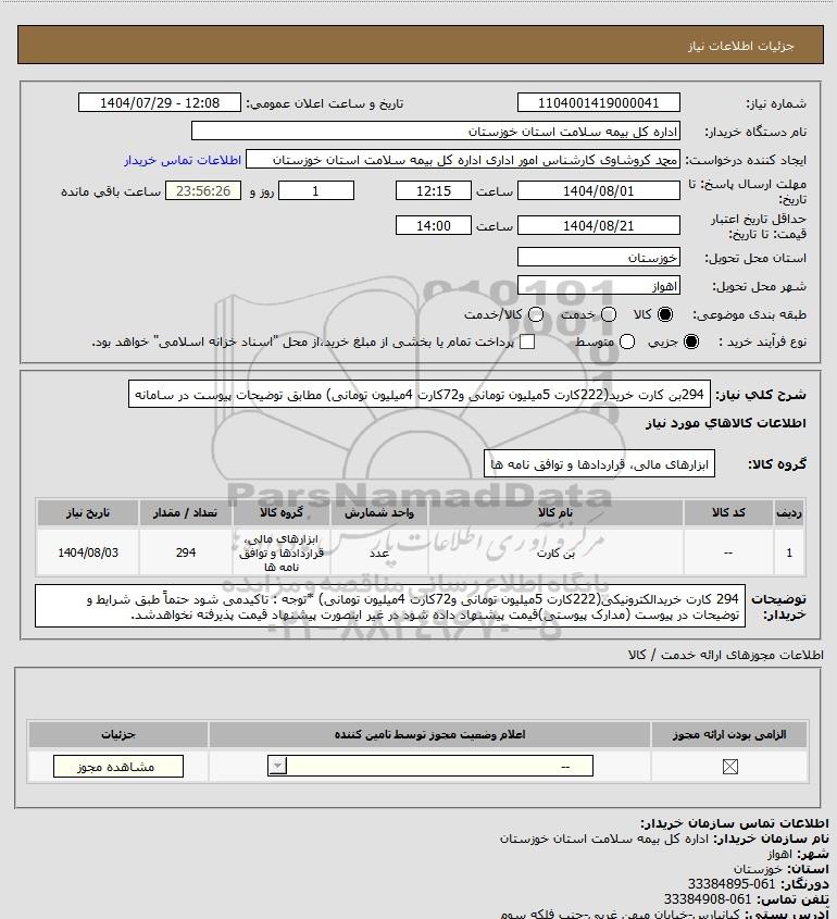 شرح کلی نیاز: 294بن کارت خرید(222کارت 5میلیون تومانی و72کارت 4میلیون تومانی) مطابق توضیحات پیوست در سامانه