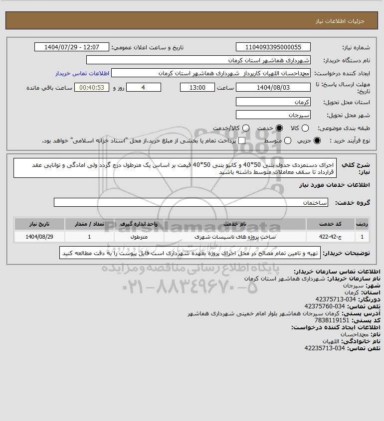 شرح کلی نیاز: اجرای دستمزدی جدول بتنی 50*40 و کانیو بتنی 50*40