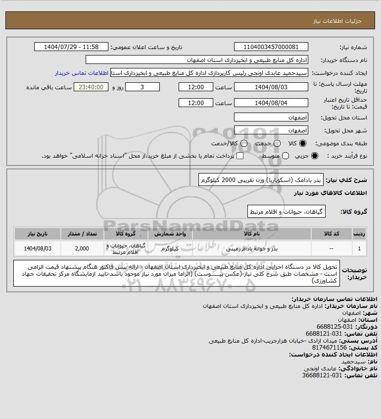 شرح کلی نیاز: بذر بادامک (اسکوپاریا) وزن تقریبی 2000 کیلوگرم