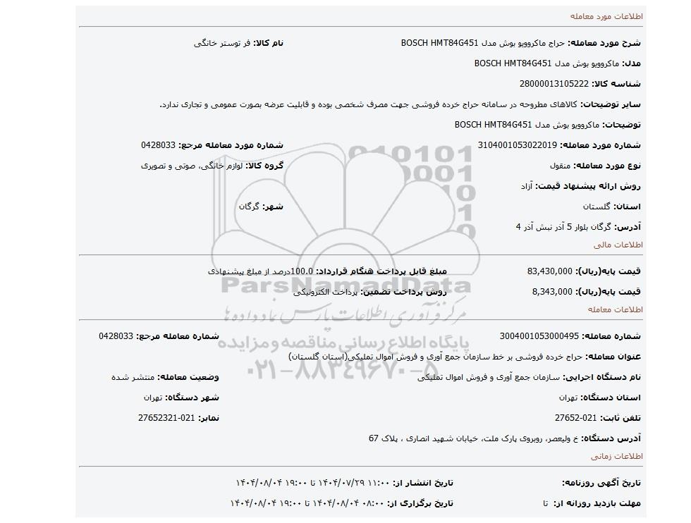 مزایده عمومی مزایده ماکروویو بوش مدل BOSCH HMT84G451 برگزار میگردد. از کلیه افراد متخصص و شرکتهای واجد شرایط دعوت به عمل میآید تا در این مزایده با کد خبرگزاری پارس نماد : 9732430 شرکت نمایند تاریخ شروع مزایده : 1404/07/29 مهلت شرکت در مزایده: تا پایان روز 1404/08/04