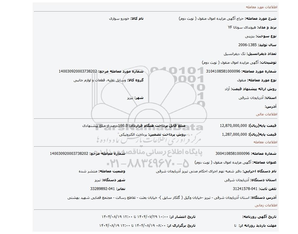 | شرح مورد معامله: حراج آگهی مزایده اموال منقول ( نوبت دوم) | نام کالا: خودرو سواری | |