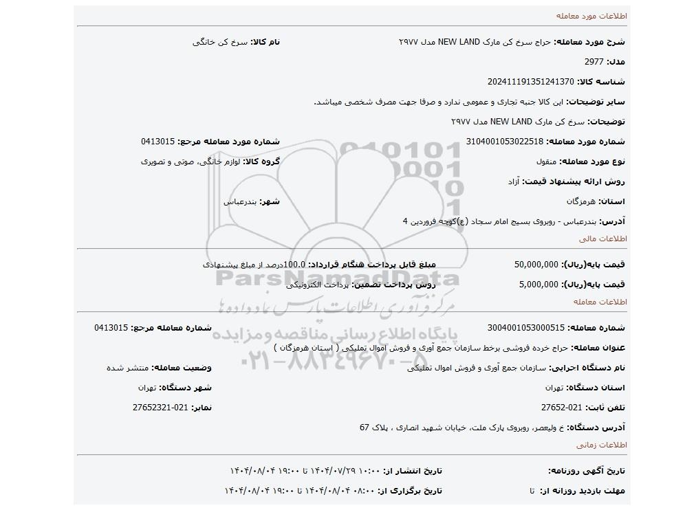 | عنوان معامله: حراج خرده فروشی برخط سازمان جمع آوری و فروش اموال تملیکی ( استان هرمزگان ) | ||