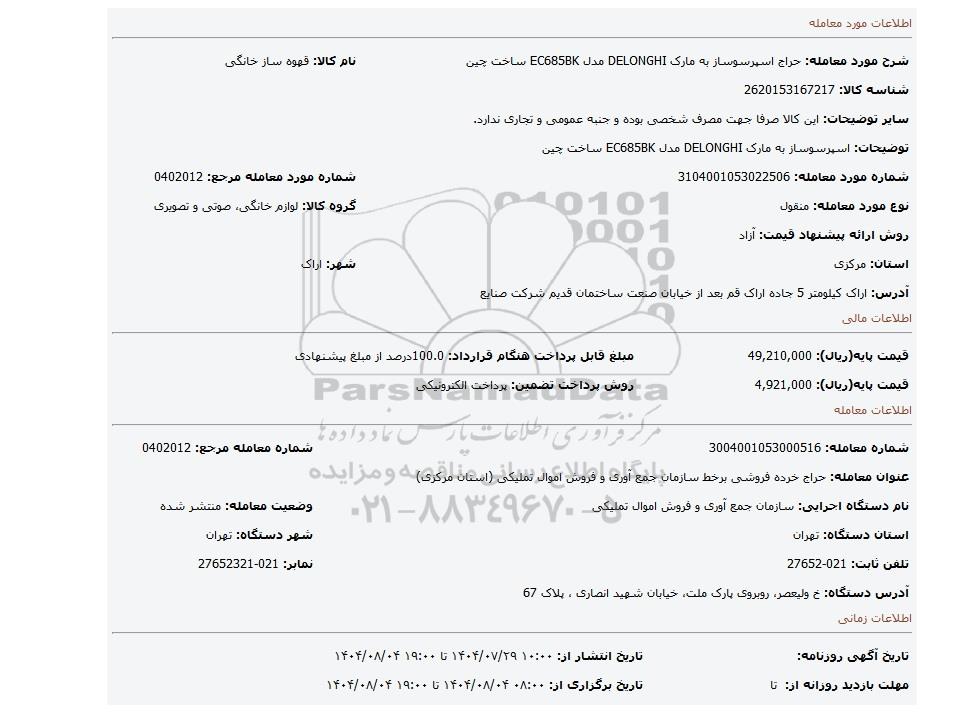 مزایده اسپرسوساز به مارک DELONGHI مدل EC685BK ساخت چین, مزایده، اسپرسوساز به مارک DELONGHI مدل EC685BK ساخت چین