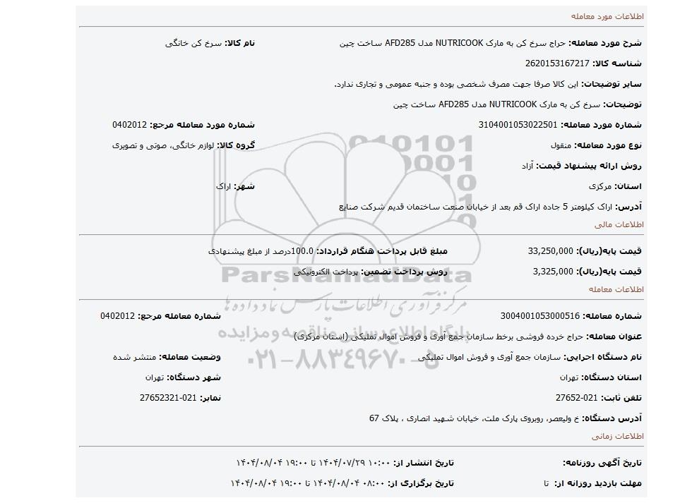 | عنوان معامله: حراج خرده فروشی برخط سازمان جمع آوری و فروش اموال تملیکی (استان مرکزی) | ||