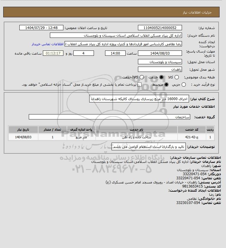شرح کلی نیاز: اجرای 16000 متر مربع زیرسازی روستای کالیکه شهرستان زاهدان