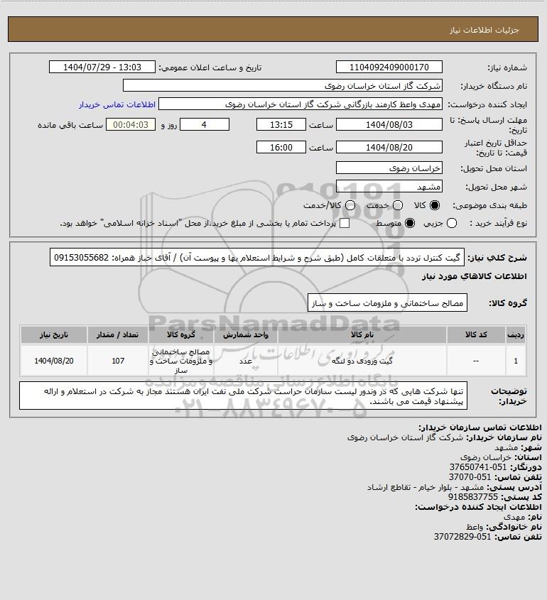 نام سازمان خریدار: شرکت گاز استان خراسان رضوی
