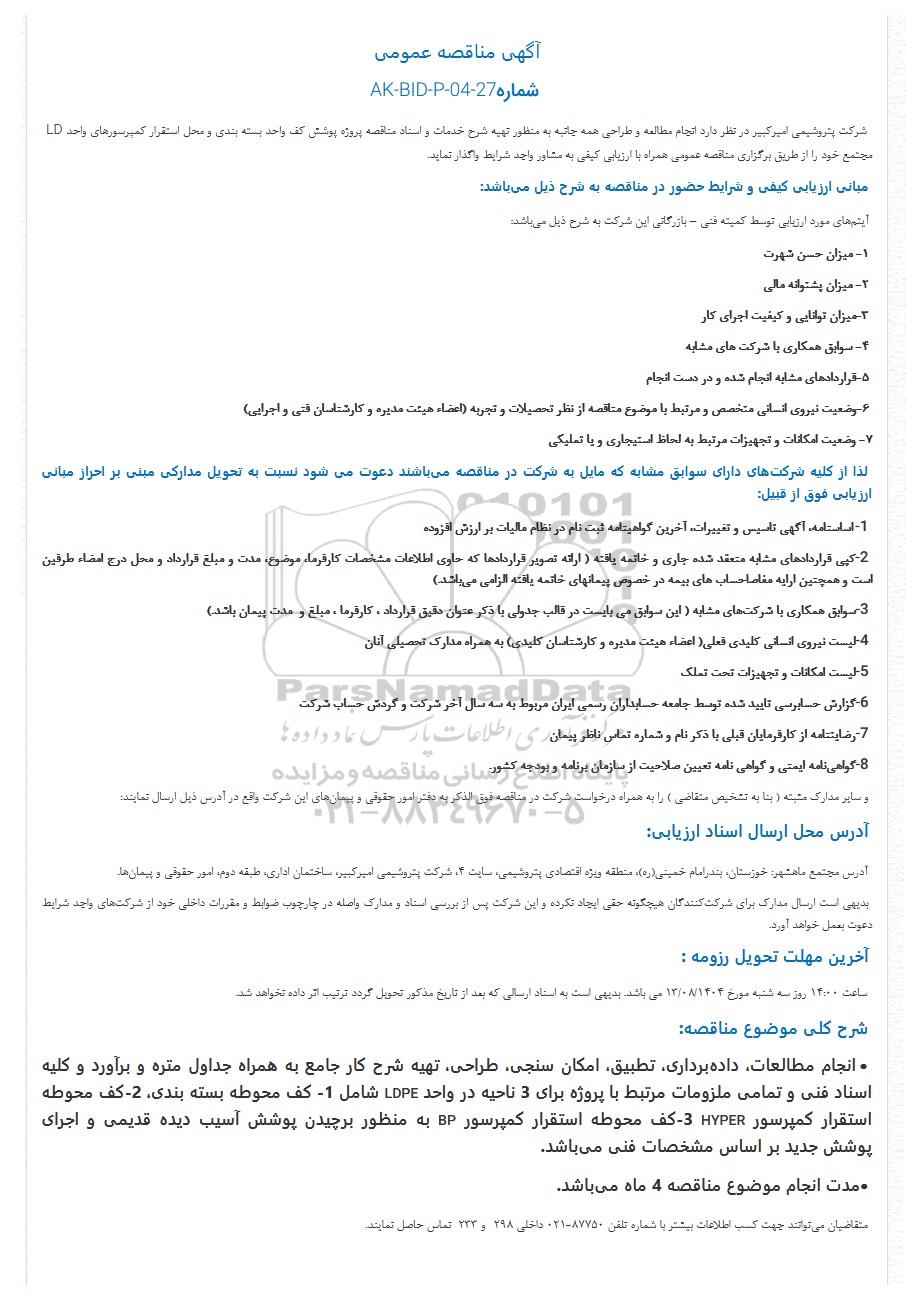 شرکت پتروشیمی امیرکبیر در نظر دارد انجام مطالعه و طراحی همه جانبه به منظور تهیه شرح خدمات و اسناد مناقصه پروژه پوشش کف واحد بسته بندی و محل استقرار کمپرسورهای واحد LD مجتمع خود را از طریق برگزاری مناقصه عمومی همراه با ارزیابی کیفی به مشاور واجد شرایط واگذار نماید.