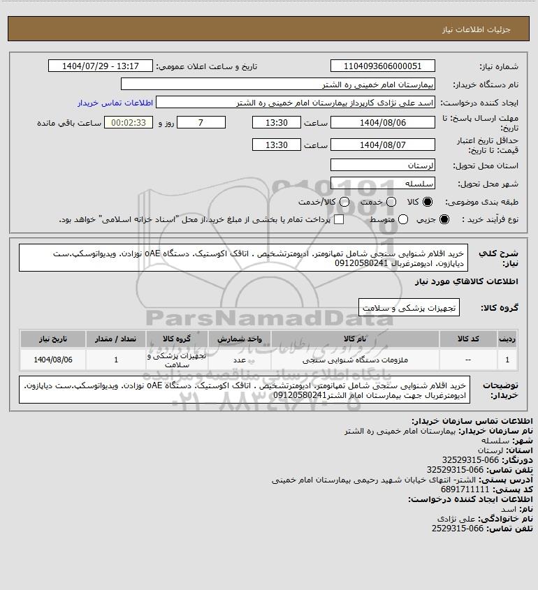 | 1 | -- | ملزومات دستگاه شنوایی سنجی | عدد | تجهیزات پزشکی و سلامت | 1 | 1404/08/06 |