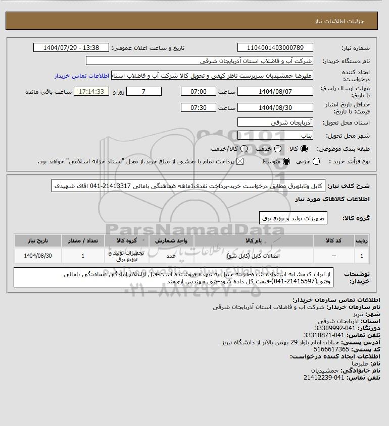 شرح کلی نیاز: کابل وتابلوبرق مطابق درخواست خرید-پرداخت نقدی1ماهه هماهنگی بامالی 21413317-041 اقای شهیدی