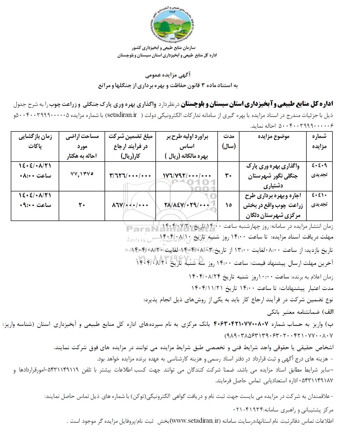 اداره کل منابع طبیعی و آبخیزداری استان سیستان و بلوچستان در نظر دارد واگذاری بهره وری پارک جنگلی و زراعت چوب را به شرح جدول ذیل با جزئیات مندرج در اسناد مزایده با بهره گیری از سامانه تدارکات الکترونیکی دولت ستاد ایران با شماره مزایده 5004003999000005 و 5004003999000006 احاله نماید.
