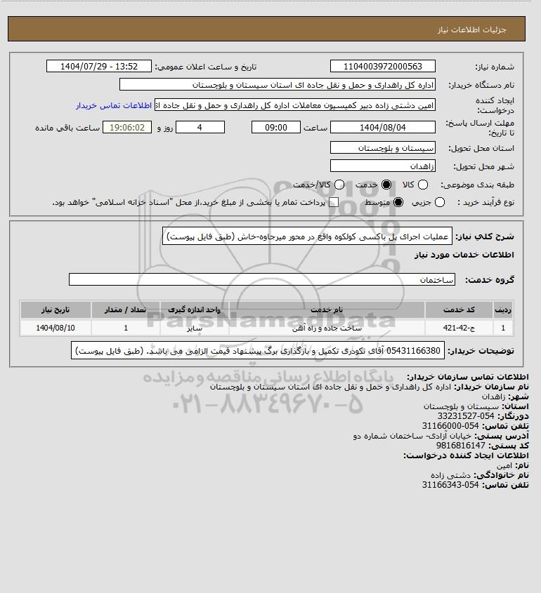 شرح کلی نیاز: عملیات اجرای پل باکسی کولکوه واقع در محور میرجاوه-خاش (طبق فایل پیوست)