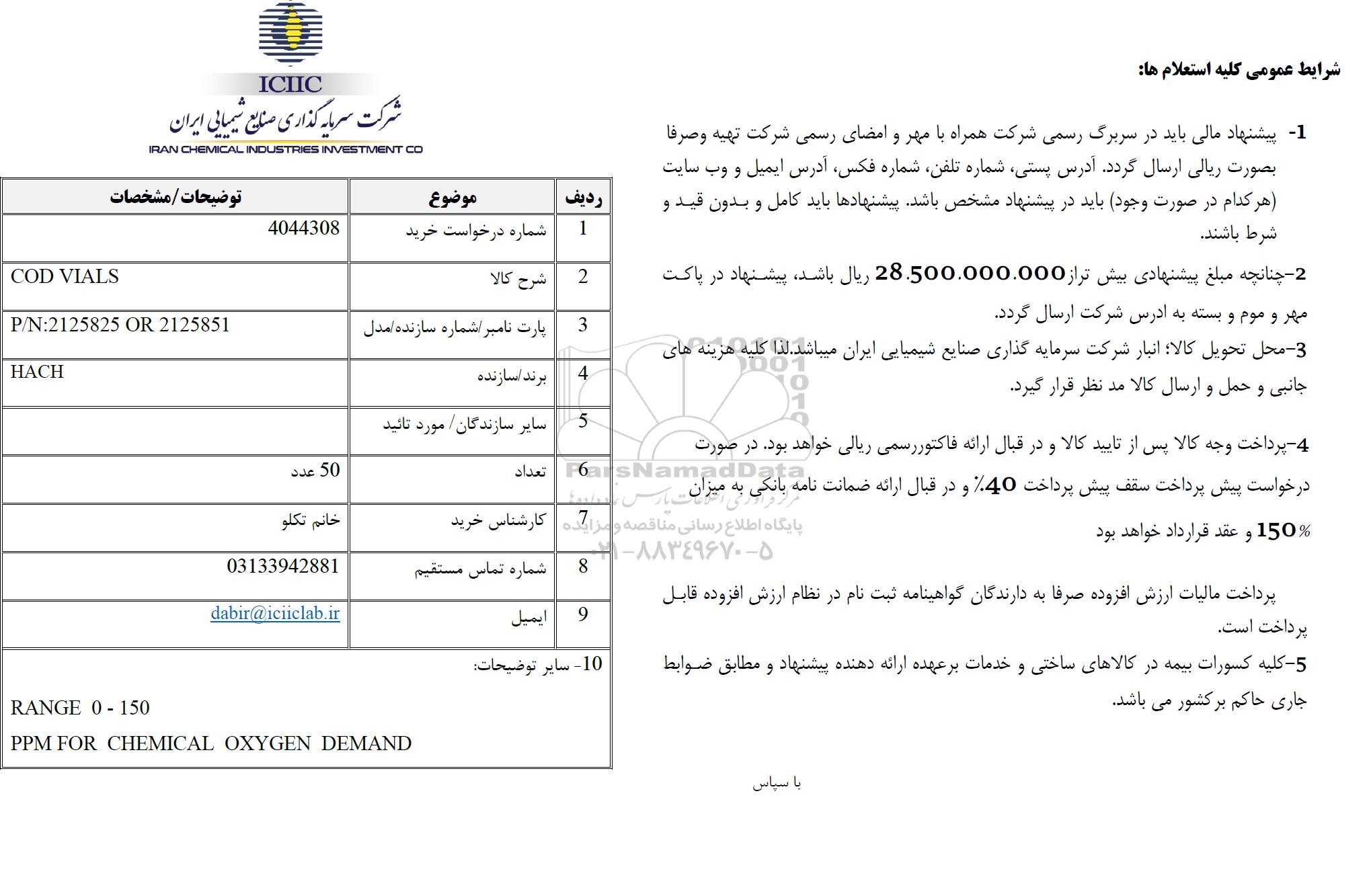3- محل تحویل کالا؛ انبار شرکت سرمایه گذاری صنایع شیمیایی ایران می باشد. لذا کلیه هزینه های جانبی و حمل و ارسال کالا مد نظر قرار گیرد.