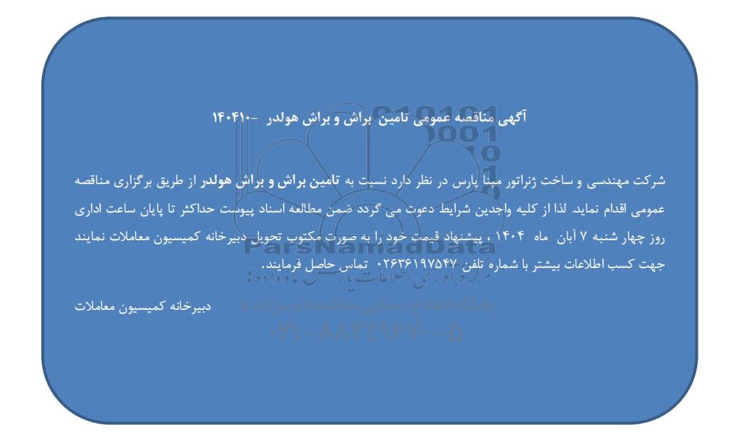 شرکت مهندسی و ساخت ژنراتور مپنا پارس در نظر دارد نسبت به تامین براش و براش هولدر از طریق برگزاری مناقصه عمومی اقدام نماید. لذا از کلیه واجدین شرایط دعوت می گردد ضمن مطالعه اسناد پیوست حداکثر تا پایان ساعت اداری روز چهارشنبه 7 آبان ماه 1404، پیشنهاد قیمت خود را به صورت مکتوب تحویل دبیرخانه کمیسیون معاملات نمایند جهت کسب اطلاعات بیشتر با شماره تلفن 02636197547 تماس حاصل فرمایند.