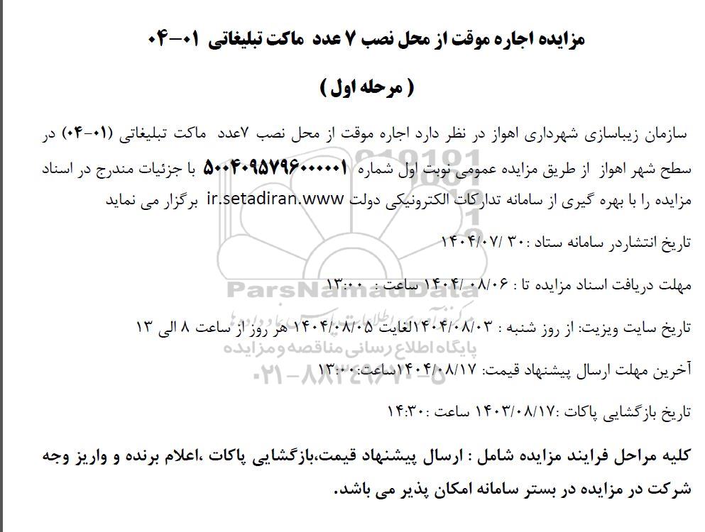 سازمان زیباسازی شهرداری اهواز در نظر دارد اجاره موقت از محل نصب 7 عدد ماکت تبلیغاتی (01-04) در سطح شهر اهواز از طریق مزایده عمومی نوبت اول شماره 5004095796000001 با جزئیات مندرج در اسناد مزایده را با بهره گیری از سامانه تدارکات الکترونیکی دولت سایت ستاد ایران برگزار می نماید.
