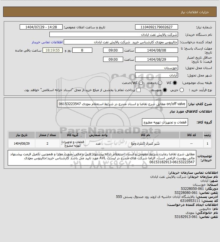 شرح کلی نیاز: on/off valve مطابق شرح تقاضا و اسناد مندرج در شرایط استعلام محمدی 06153223547