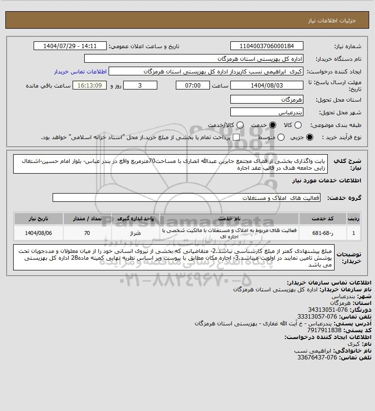 مزایده عمومی استعلام بابت واگذاری بخشی از فضای مجتمع جابربن عبدالله انصاری با مساحت70مترمربع واقع در بندر عباس- بلوار امام حسین-اشتغال زایی جامعه هدف در قالب عقد اجاره برگزار میگردد. از کلیه افراد متخصص و شرکت‌های واجد شرایط دعوت به عمل می‌آید تا در این مزایده با کد خبرگزاری پارس نماد : 9733640 شرکت نمایند تاریخ شروع مزایده : 1404/07/29 مهلت شرکت در مزایده: تا پایان روز 1404/08/03 مکان برگزاری اموال واگذاری استان‌های مزایدات استان هرمزگان و دسته‌بندی‌های مربوط به این حراجی تجهیزات پزشکی, واگذاری ورزشگاه، پارکینگ، غرفه و بوفه میباشد.