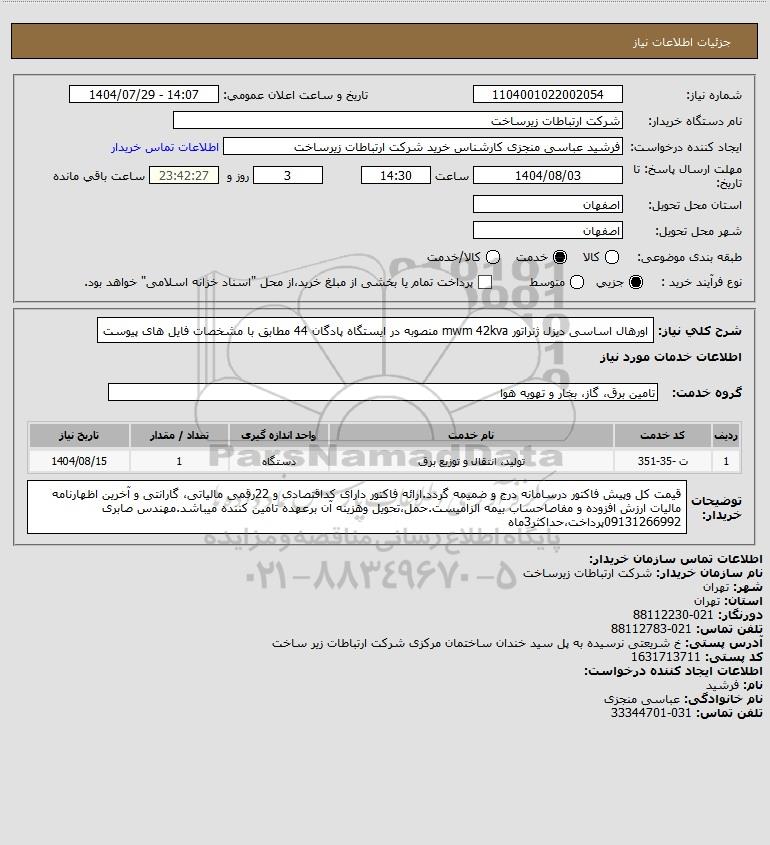 شرح کلی نیاز: اورهال اساسی دیزل ژنراتور mwm 42kva منصوبه در ایستگاه پادگان 44 مطابق با مشخصات فایل های پیوست