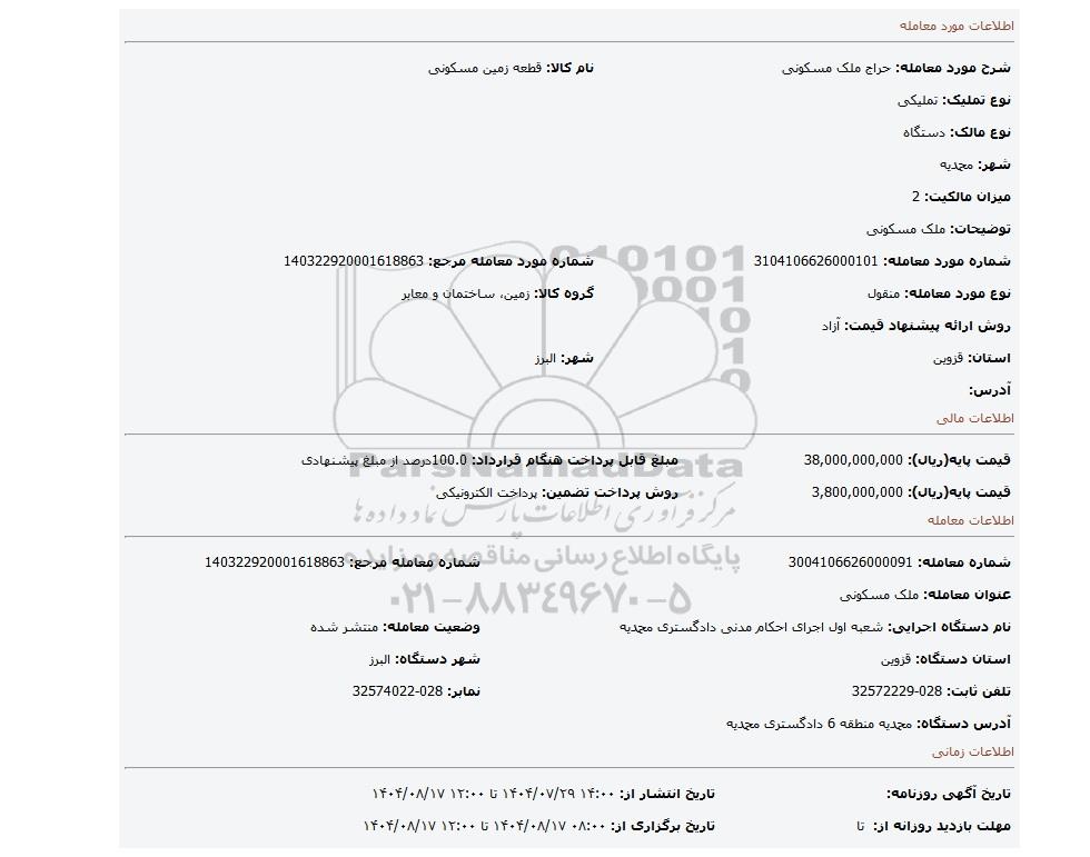 | شرح مورد معامله: حراج ملک مسکونی | نام کالا: قطعه زمین مسکونی | |