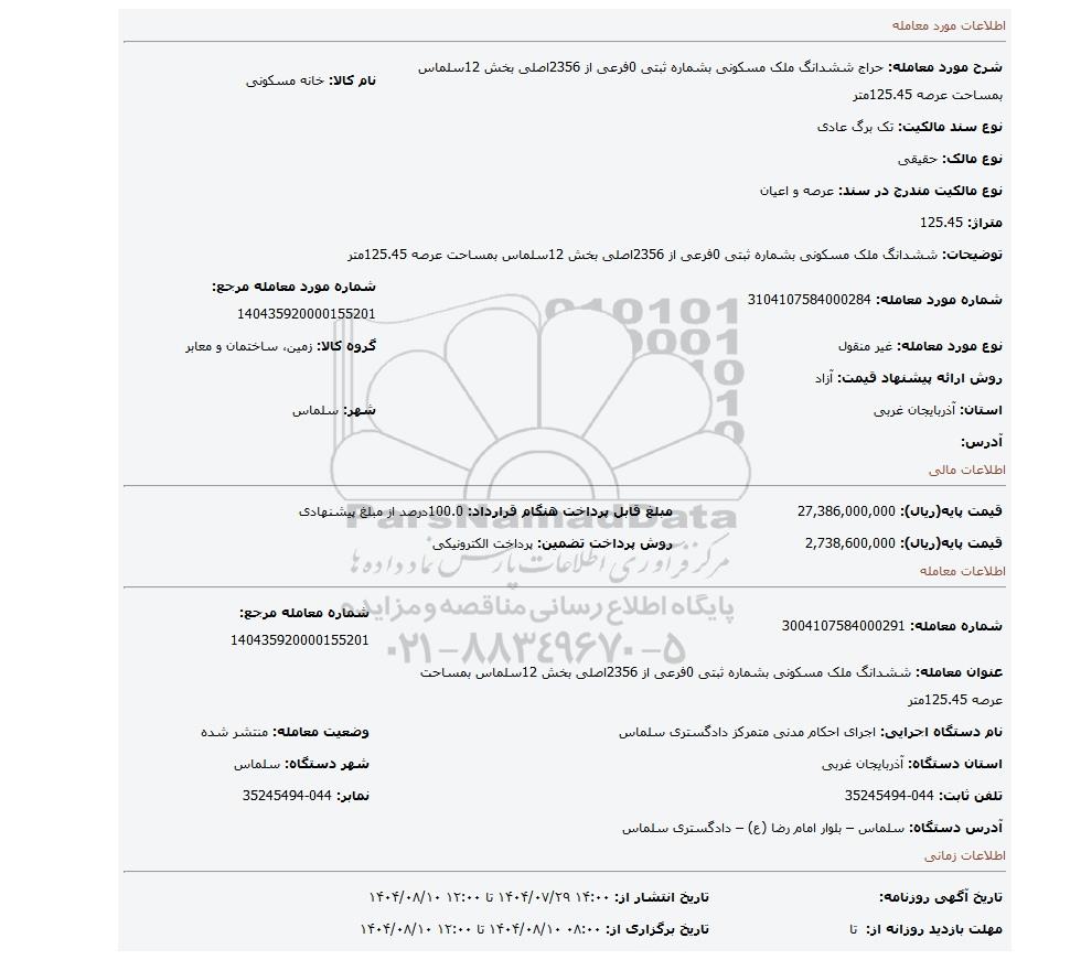 | عنوان معامله: ششدانگ ملک مسکونی بشماره ثبتی 0فرعی از 2356اصلی بخش 12سلماس بمساحت عرصه 125.45متر | ||