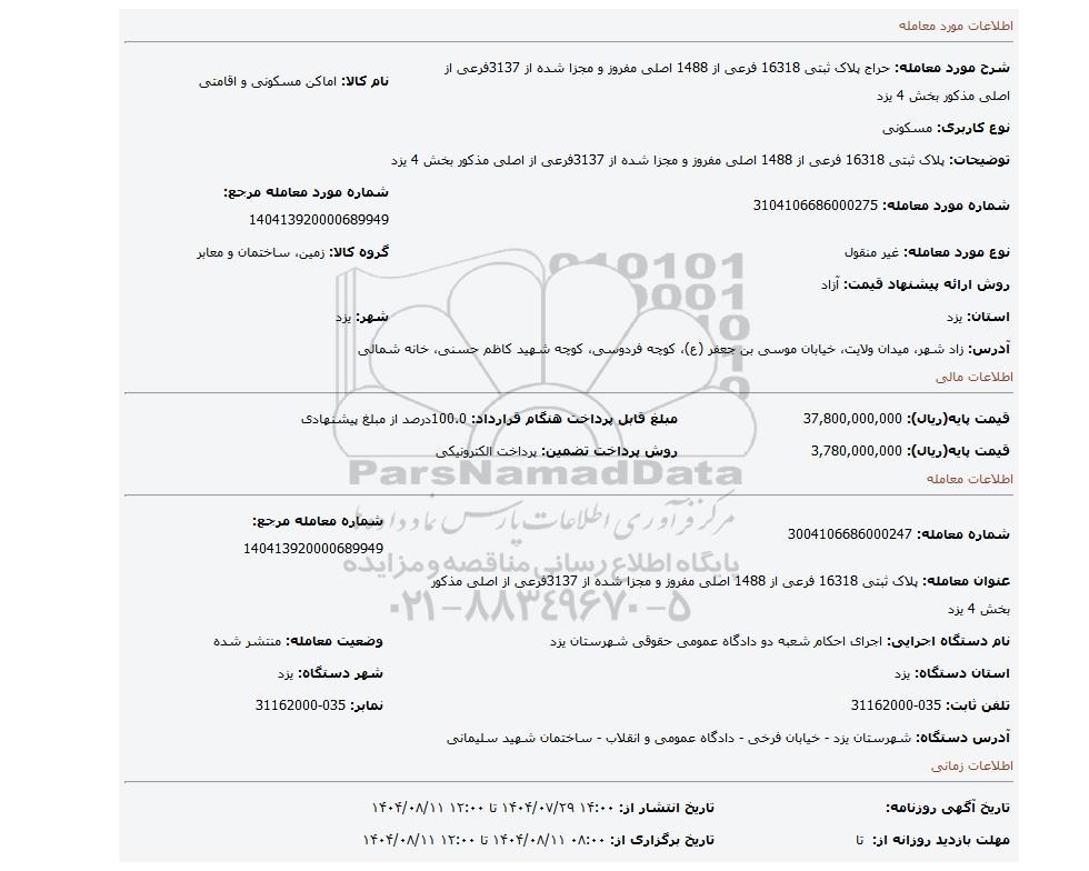 | شرح مورد معامله: حراج پلاک ثبتی 16318 فرعی از 1488 اصلی مفروز و مجزا شده از 3137فرعی از اصلی مذکور بخش 4 یزد | نام کالا: اماکن مسکونی و اقامتی | |