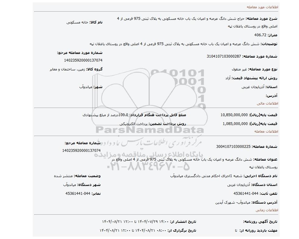 مزایده عمومی مزایده شش دانگ عرصه و اعیان یک باب خانه مسکونی به پلاک ثبتی 975 فرعی از 4 اصلی واقع در روستای یاغلان تپه برگزار میگردد. از کلیه افراد متخصص و شرکت‌های واجد شرایط دعوت به عمل می‌آید تا در این مزایده با کد خبرگزاری پارس نماد : 9733813 شرکت نمایند تاریخ شروع مزایده : 1404/07/29 مهلت شرکت در مزایده: تا پایان روز 1404/08/21 مکان برگزاری اموال واگذاری استان‌های آذربایجان غربی و دسته‌بندی‌های مربوط به این حراجی املاک و زمین میباشد.