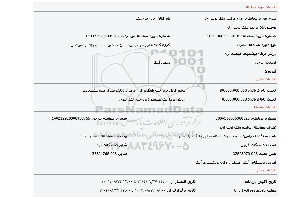 | شرح مورد معامله: حراج مزایده ملک نوبت اول | نام کالا: خانه عروسکی | |