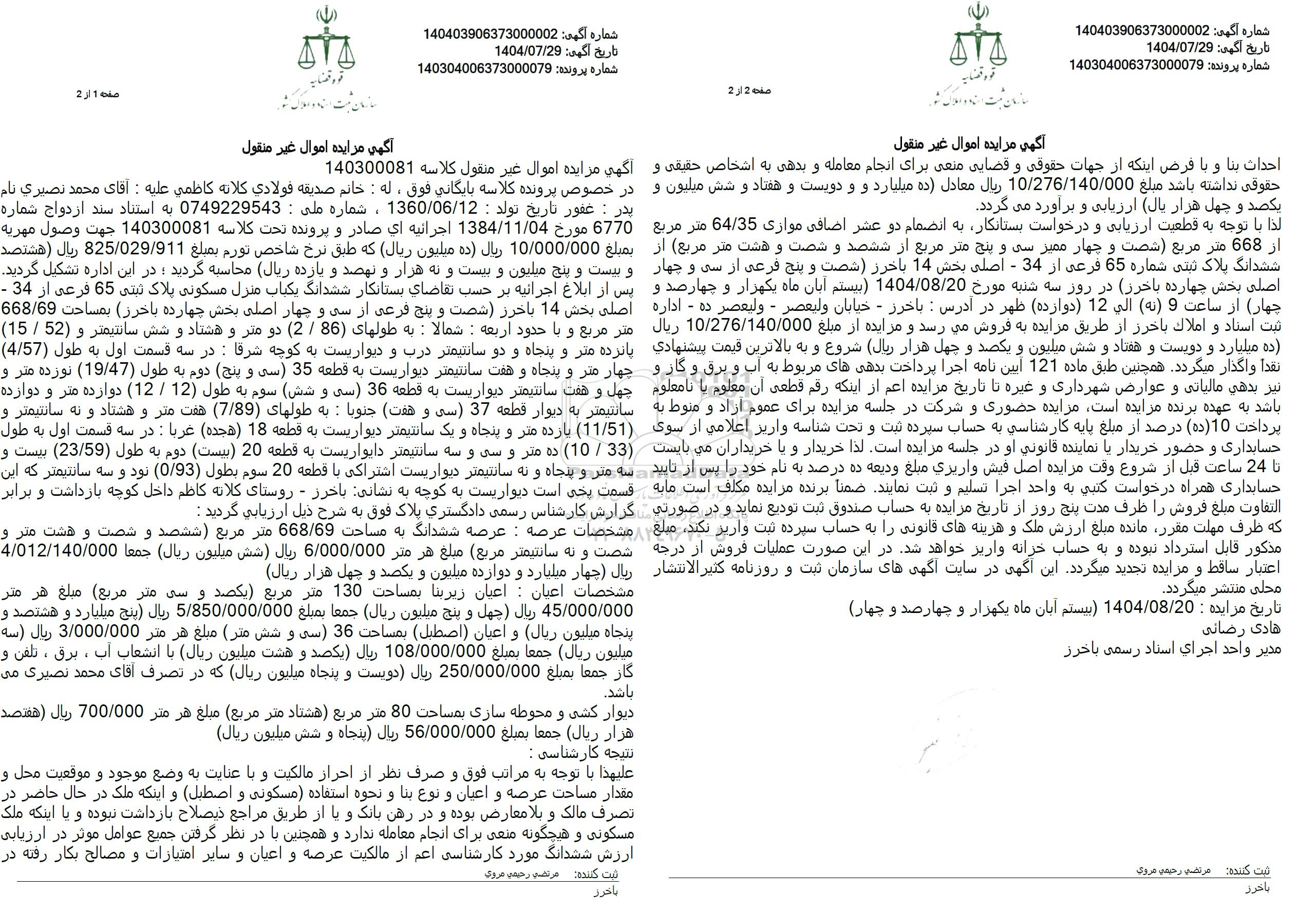 آگهی مزایده اموال غیر منقول كلاسه 140300081