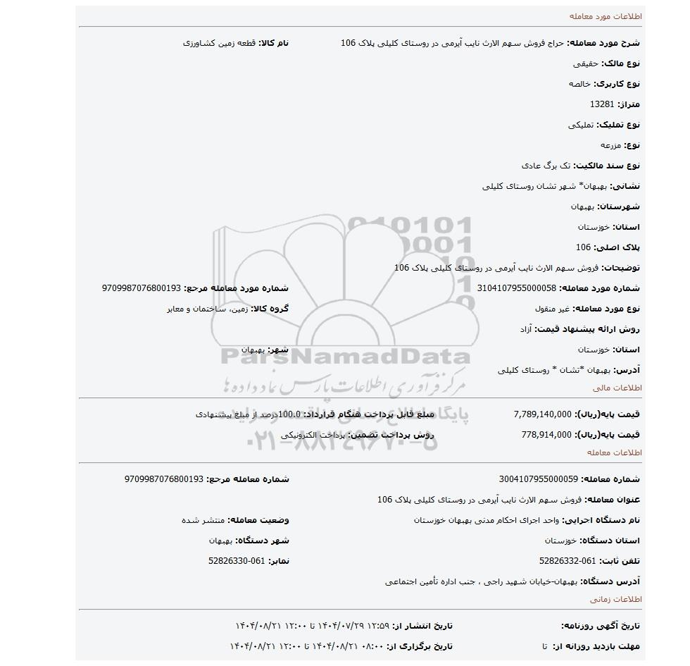 | شرح مورد معامله: حراج فروش سهم الارث نایب آیرمی در روستای کلیلی پلاک 106 | نام کالا: قطعه زمین کشاورزی | |