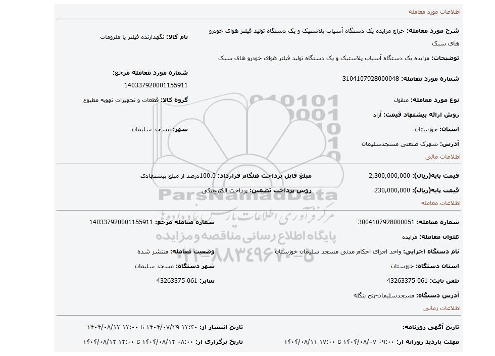 | شماره مورد معامله: 3104107928000048 | شماره مورد معامله مرجع: 140337920001155911 | |
