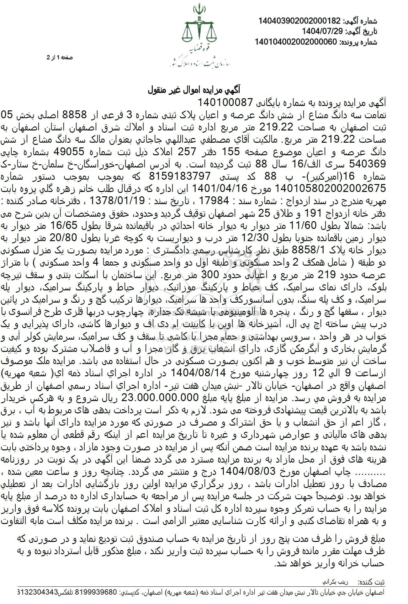 آگهی مزایده پرونده به شماره بایگانی 140100087 تمامت سه دانگ مشاع از شش دانگ عرصه و اعیان پلاک ثبتی شماره 3 فرعی از 8858 اصلی بخش 05 ثبت اصفهان به مساحت 219.22 متر مربع اداره ثبت اسناد و املاک شرق اصفهان استان اصفهان به مساحت 219.22 متر مربع مالكیت آقای مصطفی عبد اللهی جاجانی بعنوان مالک سه دانگ مشاع از شش دانگ عرصه و اعیان موضوع صفحه 155 دفتر 257 املاک ذیل ثبت شماره 49055 بشماره چاپی 540369 سری الف 16 سال 88 ثبت گردیده است. به آدرس اصفهان خوراسگان - خ سلمان خ ستار ک شماره 16 امیر کبیر) ب 88 کد پستی 8159183797 که بموجب بموجب دستور شماره 140105802002002675 مورخ 1401.04.16 این اداره که در قبال طلب خانم زهره گلی پزوه بابت مهریه مندرج در سند ازدواج : شماره سند : 17984 ، تاریخ سند : 1378.01.19 ، دفترخانه صادر کننده : دفتر خانه ازدواج 191 و طلاق 25 شهر اصفهان توقیف گردید و حدود حقوق و مشخصات آن بدین شرح می باشد شمالا بطول 11.60 متر دیوار به دیوار خانه احداثی در باقیمانده شرقا بطول 16.65 متر دیوار به دیوار زمین باقمانده جنوبا بطول 12.30 متر درب و دیواریست به کوچه غربا بطول 20.80 متر دیوار به دیوار خانه پلاک 8858.1 طبق نظر کارشناس رسمی دادگستری : مورد مزایده بصورت یک منزل مسکونی دو طبقه ) شامل همكف 2 واحد مسکونی و طبقه اول دو واحد مسکونی و جمعا 4 واحد مسکونی ) با متراژ عرصه حدود 219 متر مربع و اعیانی حدود 300 متر مربع این ساختمان با اسکلت بتنی و سقف تیرچه بلوک دارای نمای سرامیک کف حیاط و پارکینگ موزائیک دیوار حیاط و پارکینگ سرامیک دیوار پله سرامیک و کف پله سنگ بدون آسانسور کف واحدها سرامیک دیوارها ترکیب گچ و رنگ و سرامیک در پائین دیوار ، سقفها گچ و رنگ ، پنجره ها آلومینیومی با شیشه تک جداره چهارچوب دربها فلری طرح فرانسوی با درب پیش ساخته اچ پی ال آشپزخانه ها اوین با کابینت ام دی اف و دیوارها کاشی دارای پذیرایی و یک خواب در هر واحد ، سرویس بهداشتی و حمام مجزا با کاشی تا سقف و کف سرامیک سرمایش کولر آبی و گرمایش بخاری و آبگرمکن گازی دارای انشعاب برق و گاز مجزا و آب و فاضلاب مشترک بوده و کیفیت ساخت آن نیز متوسط خوب و هم اکنون بصورت مسکونی در حال استفاده می باشد مزایده ملک موصوف از ساعت 9 الی 12 روز چهارشنبه مورخ 1404.08.14 در اداره اجرای استاد ذمه ای ( شعبه مهریه اصفهان واقع در اصفهان خیابان تالار نبش میدان هفت تیر اداره اجرای اسناد رسمی اصفهان از طریق مزایده به فروش میرسد مزایده از مبلغ پایه مبلغ 23.000.000.000 ریال شروع و به هرکس خریدار باشد به بالاترین قیمت پیشنهادی فروخته میشود. لازم به ذکر است پرداخت بدهی های مربوط به آب ، برق ، گاز اعم از حق انشعاب و یا حق اشتراک و مصرف در صورتی که مورد مزایده دارای آنها باشد و نیز بدهی های مالیاتی و عوارض شهرداری و غیره تا تاریخ مزایده اعم از اینکه رقم قطعی آن معلوم شده یا نشده باشد به عهده برنده مزایده است ضمن آنکه پس از مزایده در صورت وجود مازاد، وجوه پرداختی بابت هزینه های فوق از محل مازاد به برنده مزایده مسترد میگردد ضمنا این آگهی در یک نوبت در روزنامه چاپ اصفهان مورخ 1404.08.03 درج و منتشر میگردد چنانچه روز و ساعت معین شده ، مصادف با روز تعطیل ادارات باشد، روز برگزاری مزایده اولین روز بازگشایی ادارات بعد از تعطیلی خواهد بود. توضیحاً جهت شرکت در جلسه مزایده پس از مراجعه به حسابداری اداره ده درصد از مبلغ پایه مزایده را به حساب تمرکز وجوه سپرده اداره کل ثبت اسناد و املاک اصفهان بابت پرونده کلاسه فوق واریز و به همراه تقاضای کتبی و ارائه کارت شناسایی معتبر الزامی است. برنده مزایده مکلف است ما به التفاوت