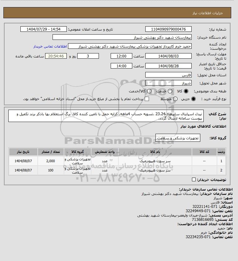 | 1 | -- | سر سوزن هیپودرمیک | عدد | تجهیزات پزشکی و سلامت | 2,000 | 1404/08/07 |
