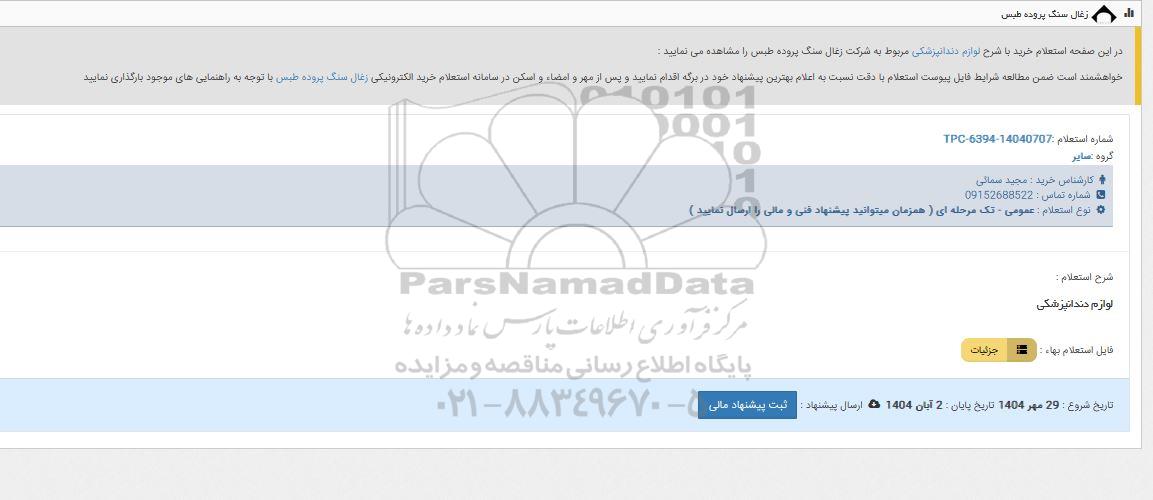 در این صفحه استعلام خرید با شرح لوازم دندانپزشکی به شرکت سنگ پروده طبس را مشاهده می نمایید :