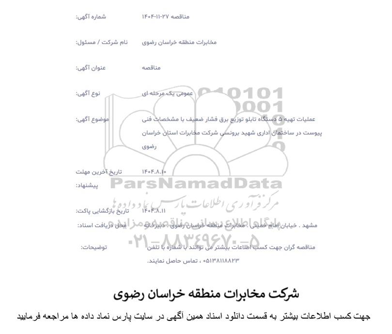موضوع آگهی: عملیات تهیه 5 دستگاه تابلو توزیع برق فشار ضعیف با مشخصات فنی پیوست در ساختمان اداری شهید برونسی شرکت مخابرات استان خراسان رضوی