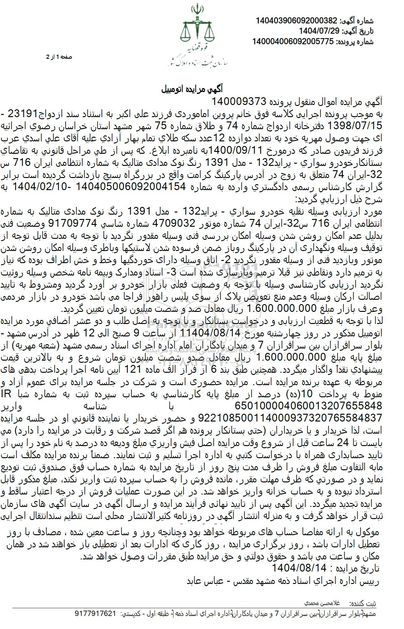 شناسه لذا با توجه به قطعیت ارزیابی و درخواست بستانکار و با توجه به اصل طلب و دو عشر اضافی مورد مزایده اتومبیل مذکور در روز چهارشنبه مورخ 11404.08.14 از ساعت 9 صبح الى 12 ظهر در آدرس مشهد -بلوار سرافرازان بین سرافرازان 7 و میدان یادگاران امام اداره اجرای استاد رسمی مشهد (شعبه مهریه از مبلغ پایه مبلغ 1.600.000.000 ریال معادل صدو شصت میلیون تومان شروع و به بالاترین قیمت پیشنهادی نقدا واگذار میگردد. همچنین طبق بند 6 از فراز الف ماده 121 آیین نامه اجرا پرداخت بدهی های مربوطه به عهده برنده مزایده است. مزایده حضوری است و شرکت در جلسه مزایده برای عموم آزاد و منوط به پرداخت (10 ده درصد از مبلغ پایه کارشناسی به حساب سپرده ثبت به شماره شبا IR با واریز