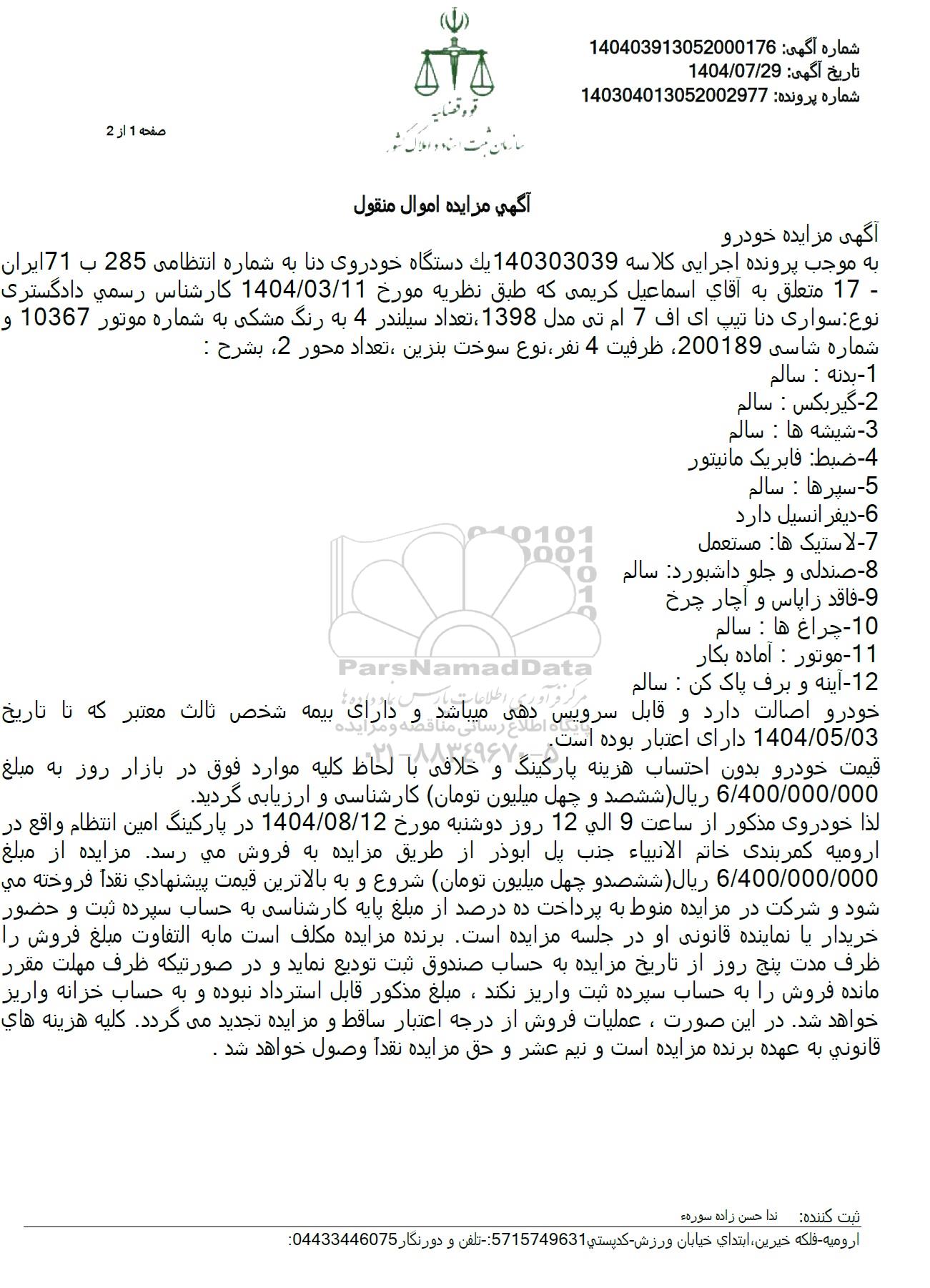 آگهی مزایده خودروبه موجب پرونده اجرایی کلاسه 140303039 یک دستگاه خودروی دنا به شماره انتظامی 285 ب 71 ایران- 17 متعلق به آقای اسماعیل کریمی که طبق نظریه مورخ 1404.03.11 کارشناس رسمی دادگستری نوع: سواری دنا تیپ ای اف 7 ام تی مدل 1398 ، تعداد سیلندر 4 به رنگ مشکی به شماره موتور 10367 و شماره شاسی 200189 ظرفیت 4 نفر نوع سوخت بنزین تعداد محور 2 بشرح :