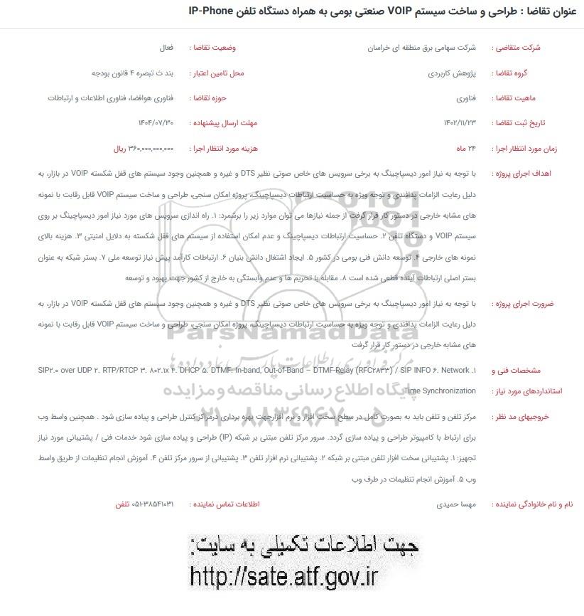 فراخوان طراحی و ساخت سیستم VOIP صنعتی بومی به همراه دستگاه تلفن IP-Phone از کلیه افراد متخصص و شرکتها واجد شرایط دعوت به عمل میآید در مناقصه با کد خبرگزاری پارس نماد: 9734036 شرکت نمایند.