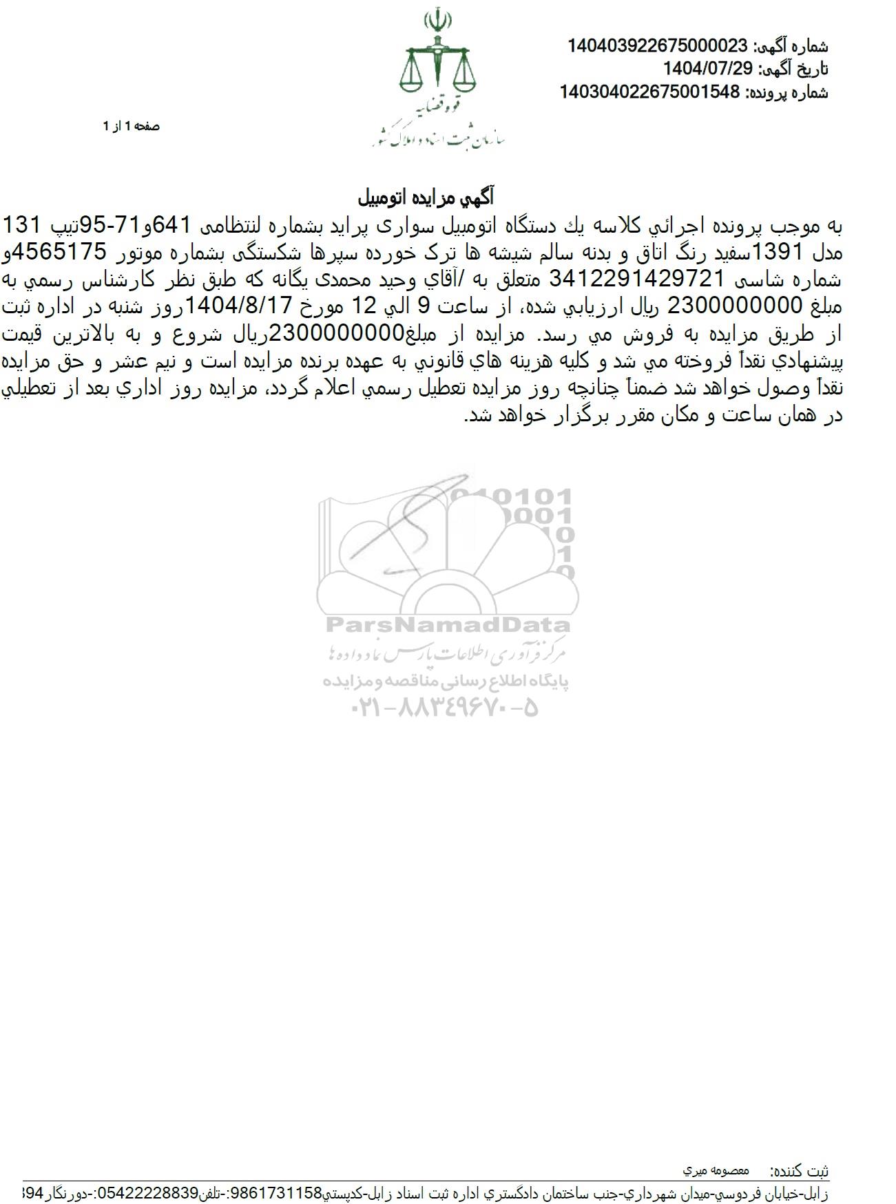 به موجب پرونده اجرائی كلاسه یک دستگاه اتومبیل سواری پراید بشماره انتظامی 641 و 71-95 تیپ 131 مدل 1391 سفید رنگ اتاق و بدنه سالم شیشه ها ترک خورده سپرها شکستگی بشماره موتور 4565175 و شماره شاسی 3412291429721 متعلق به آقای وحید محمدی یگانه که طبق نظر کارشناس رسمی به مبلغ 2300000000 ریال ارزیابی شده از ساعت 9 الی 12 مورخ 1404.8.17 روز شنبه در اداره ثبت از طریق مزایده به فروش میرسد. مزایده از مبلغ 2300000000 ریال شروع و به بالاترین قیمت پیشنهادی نقدا فروخته می شد و کلیه هزینه های قانونی به عهده برنده مزایده است و نیم عشر و حق مزایده نقداً وصول خواهد شد ضمنا چنانچه روز مزایده تعطیل رسمی اعلام گردد مزایده روز اداری بعد از تعطیلی در همان ساعت و مکان مقرر برگزار خواهد شد.