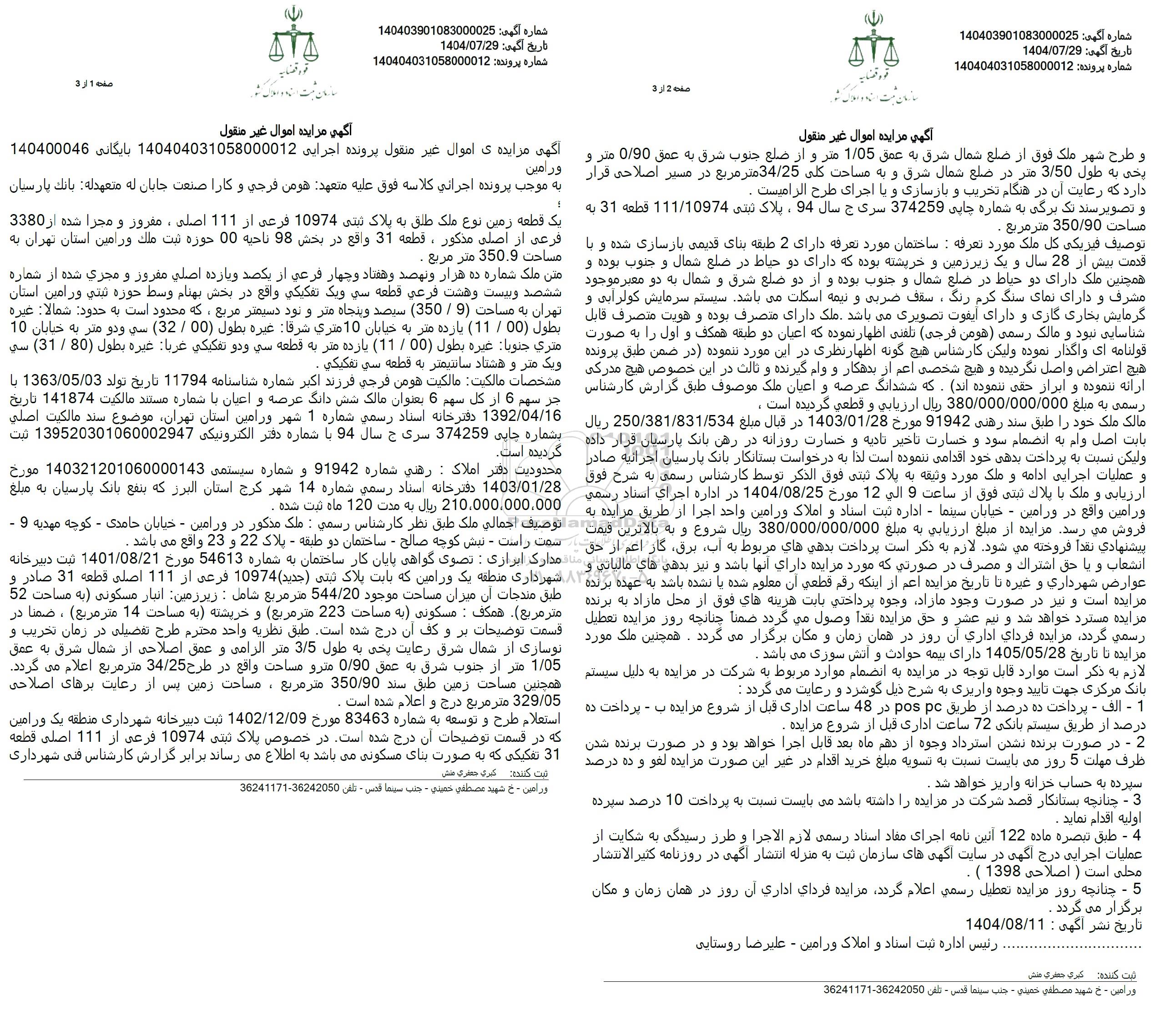 اگهی مزایده ی اموال غیر منقول پرونده اجرایی 140404031058000012 بایگانی 140400046 ورامین